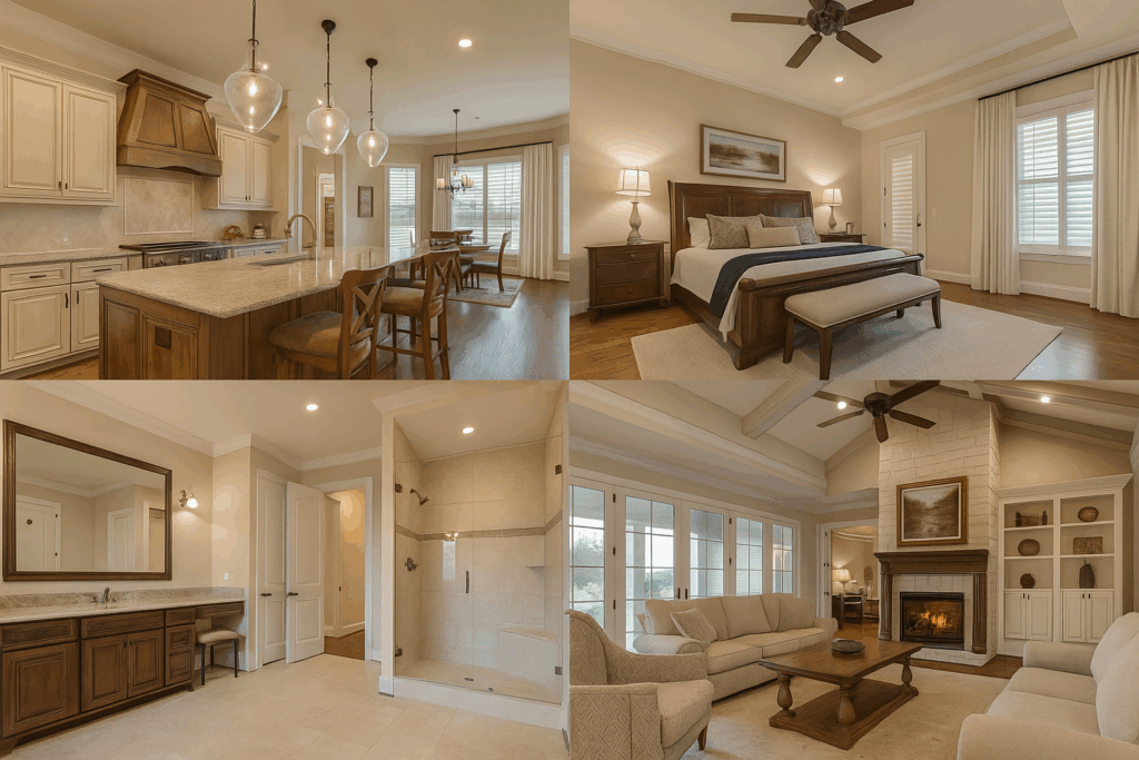 Casa d’estil clàssic contemporani de 400–480 m² en una sola planta, amb 4 dormitoris, 3 banys, cuina amb illa, saló amb llar de foc i grans espais exteriors enjardinats. Elegància, llum i confort en un entorn tranquil i exclusiu.